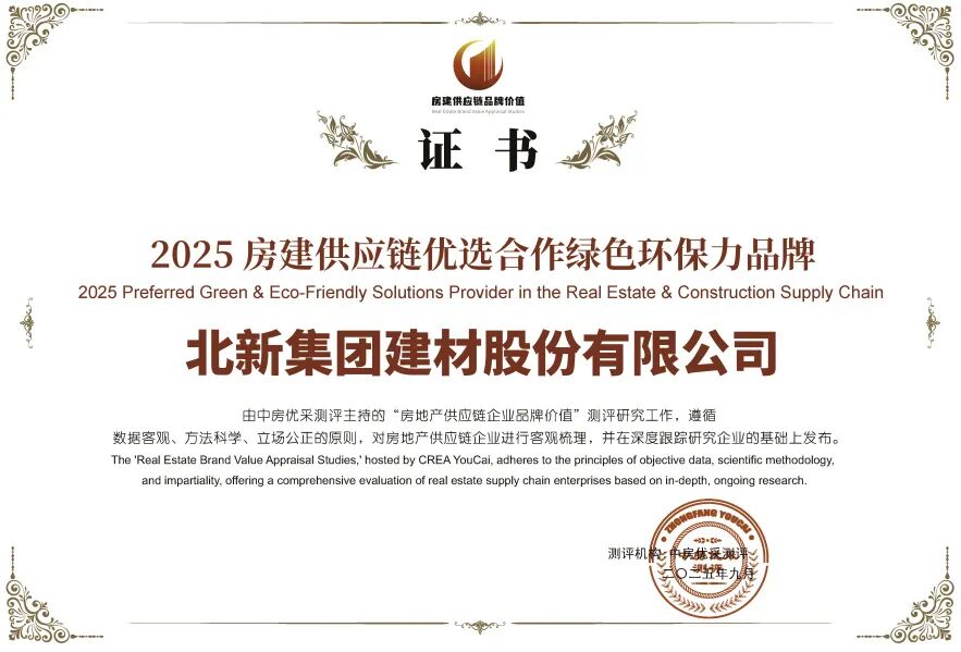 近日,由中国房地产业协会指导、上海易居房地产研究院和克而瑞集团共同主持开展的2025年房地产企业品牌价值测评成果发布会召开。会上发布了《2025房地产企业品牌价值测评研究报告》以及房建供应链优选合作品牌系列等榜单。北新建材凭借在绿色环保和可持续发展实践中的突出表现,荣获“2025房建供应链优选合作绿色环保力品牌”。