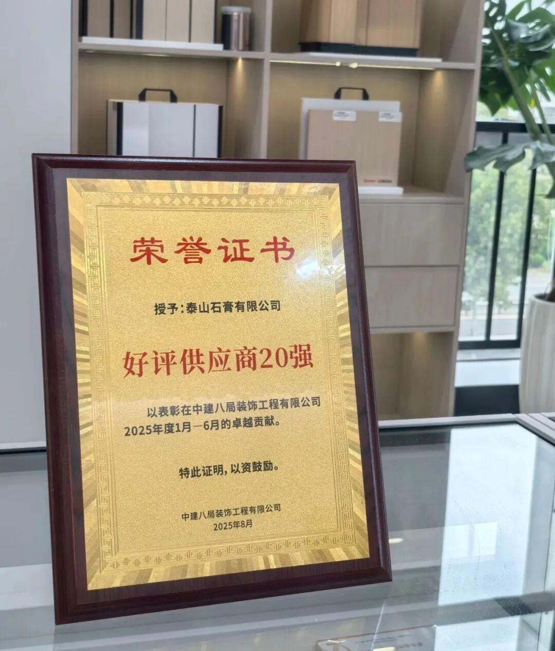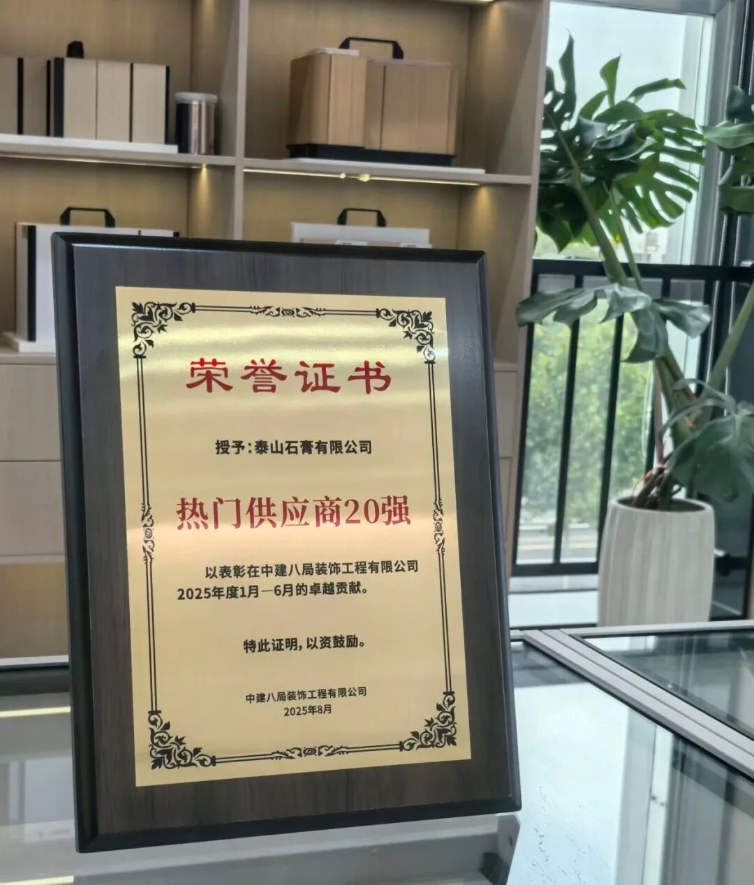 近日,泰山石膏荣获中建八局装饰工程有限公司颁发的“好评供应商20强”和“热门供应商20强”双项殊荣,在供应链领域再获重要认可。此次获奖不仅代表合作伙伴对泰山石膏产品品质和服务能力等多方面的综合肯定,更是双方长期战略合作关系的又一次升华。