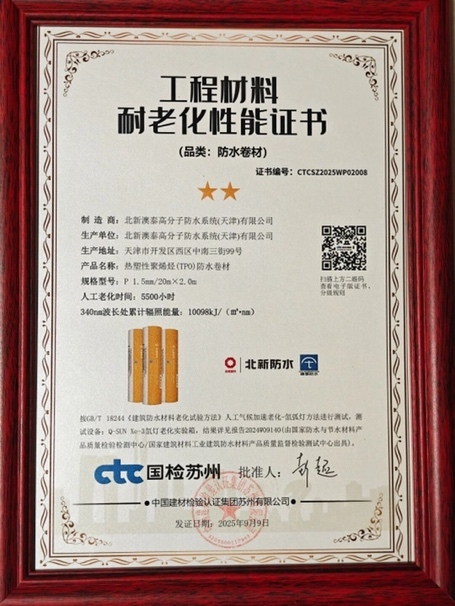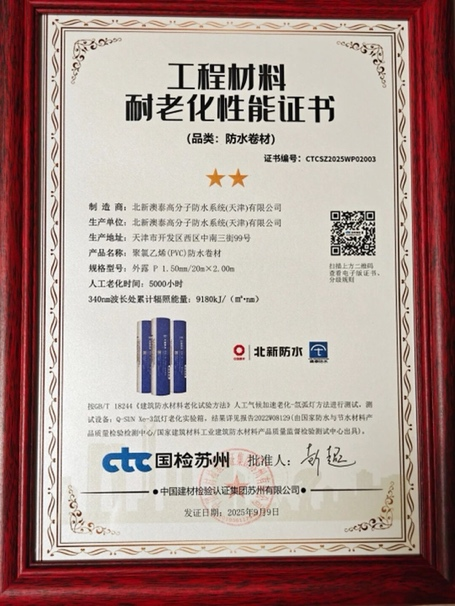 北新防水两款高分子产品获评“工程材料耐老化性能证书”